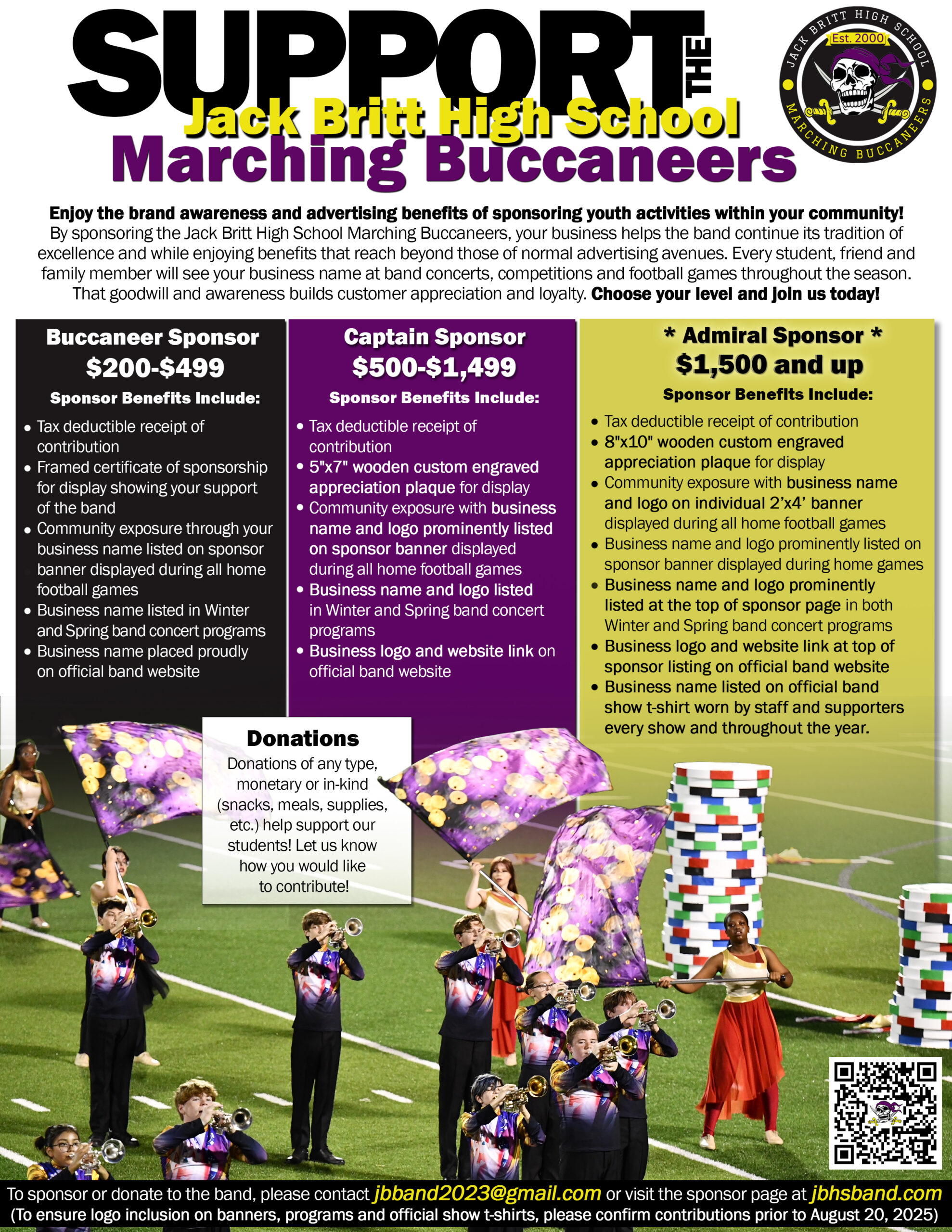Your contribution, along with other businesses in the community, help to offset the costs of uniforms, props and displays, transportation for the band and all equipment, purchase and maintenance of instruments that are too expensive for personal ownership such as the tuba and marimba. As a sponsor, you not only become a vital way to help the band continue its tradition of excellence. You also become involved in shaping our students, providing them with much‐needed funds to keep the band program and all its benefits alive. You enjoy the benefits of sponsorship that come full circle in the form of direct advertising, in-person promotion, goodwill within the community and more. Join the Jack Britt Marching Buccaneers by becoming a sponsor today!
